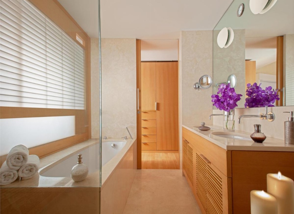 Large, modern suite designed by Richard Meier, with oak furnishings, a seating area, and free wired internet.